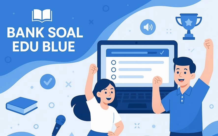Ini adalah struktur bank soal berbasis HTML + JavaScript dengan nuansa pendidikan biru–putih. Alurnya: (1) penjelasan → (2) isi nama → (3) kerjakan 10 soal satu per satu. Setiap jawaban diberi apresiasi suara yang menyebutkan nama Anda. Di akhir, sistem membacakan nilai total.
